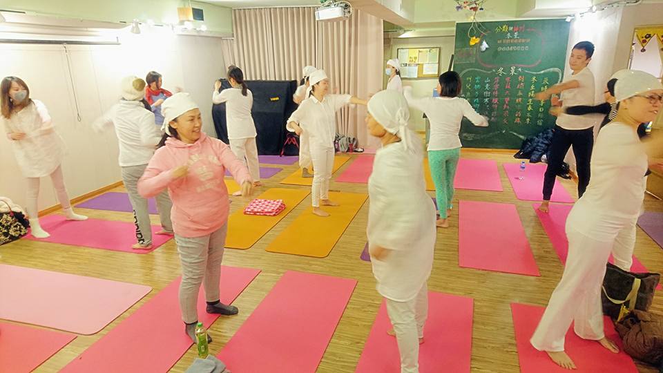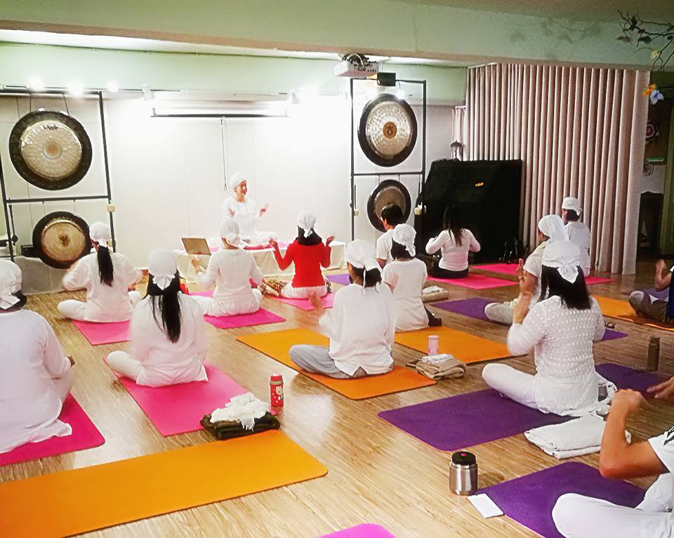 教室裏放了四面大鑼,每堂做完昆達里尼瑜伽,學員躺下來大休息時,我就敲銅鑼浴。