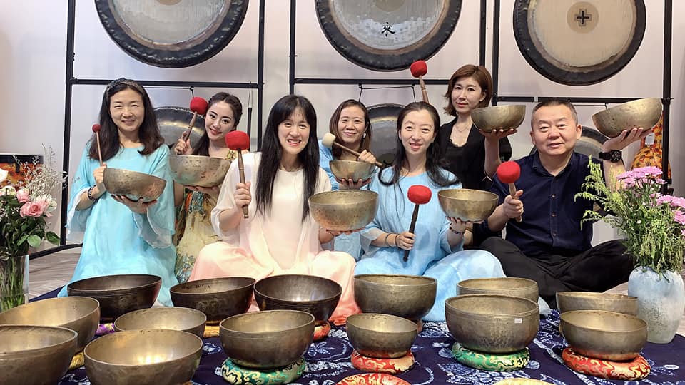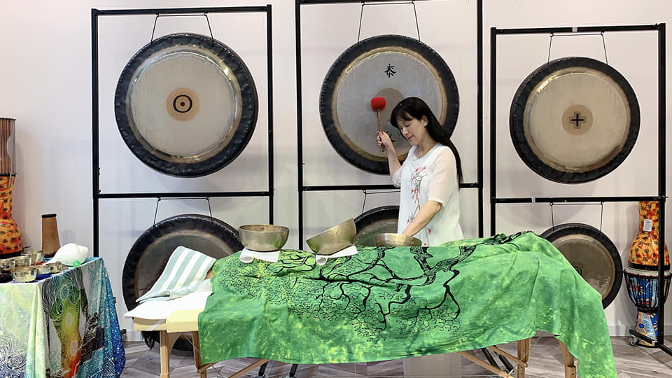 二階時,我示範如何一個人同時敲奏個案身上三個缽、與現場的銅鑼,並串聯小唱碗的演奏、雷管、丁夏、海螺、即興吟唱與精油芳療,學生們大開眼界之餘,問我:下次何時再到北京?他們想要再來複訓,也希望我能有機會去教牌卡、銅鑼課。
