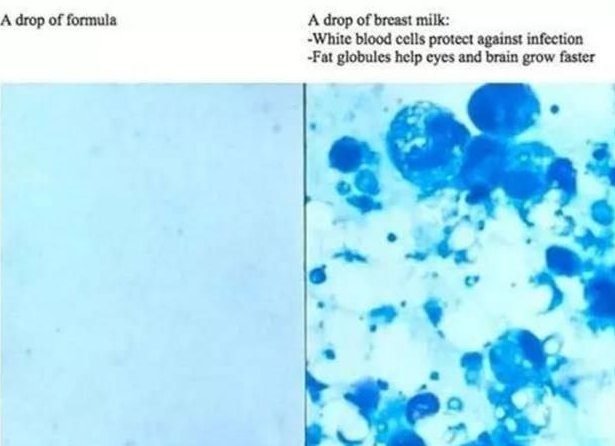 可見,配方奶中是沒有細胞的,而母乳中含有大量的白細胞和脂肪球,白細胞可以增強免疫力,脂肪球幫助嬰兒眼睛和大腦快速的成長。