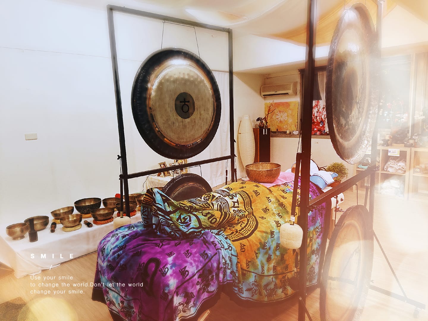 晚間的兩個個案好幸福!被四面大鑼包圍著,三缽齊鳴在身上振動整條中脈,和諧的音頻從頭貫穿到腳底;四面大鑼在旁推波助瀾,音流如潮的籠罩個案氣場與整個存在,身心意識都化入了音流的海洋。