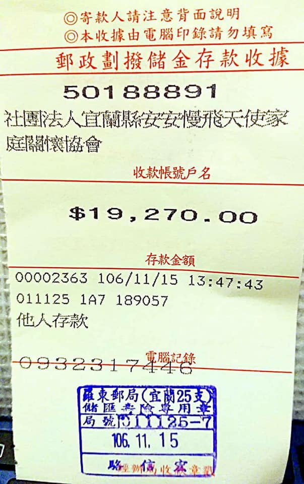 11/8 慵懶音流浴公益活動後捐款[社團法人宜蘭縣安安慢飛天使家庭關懷協會]